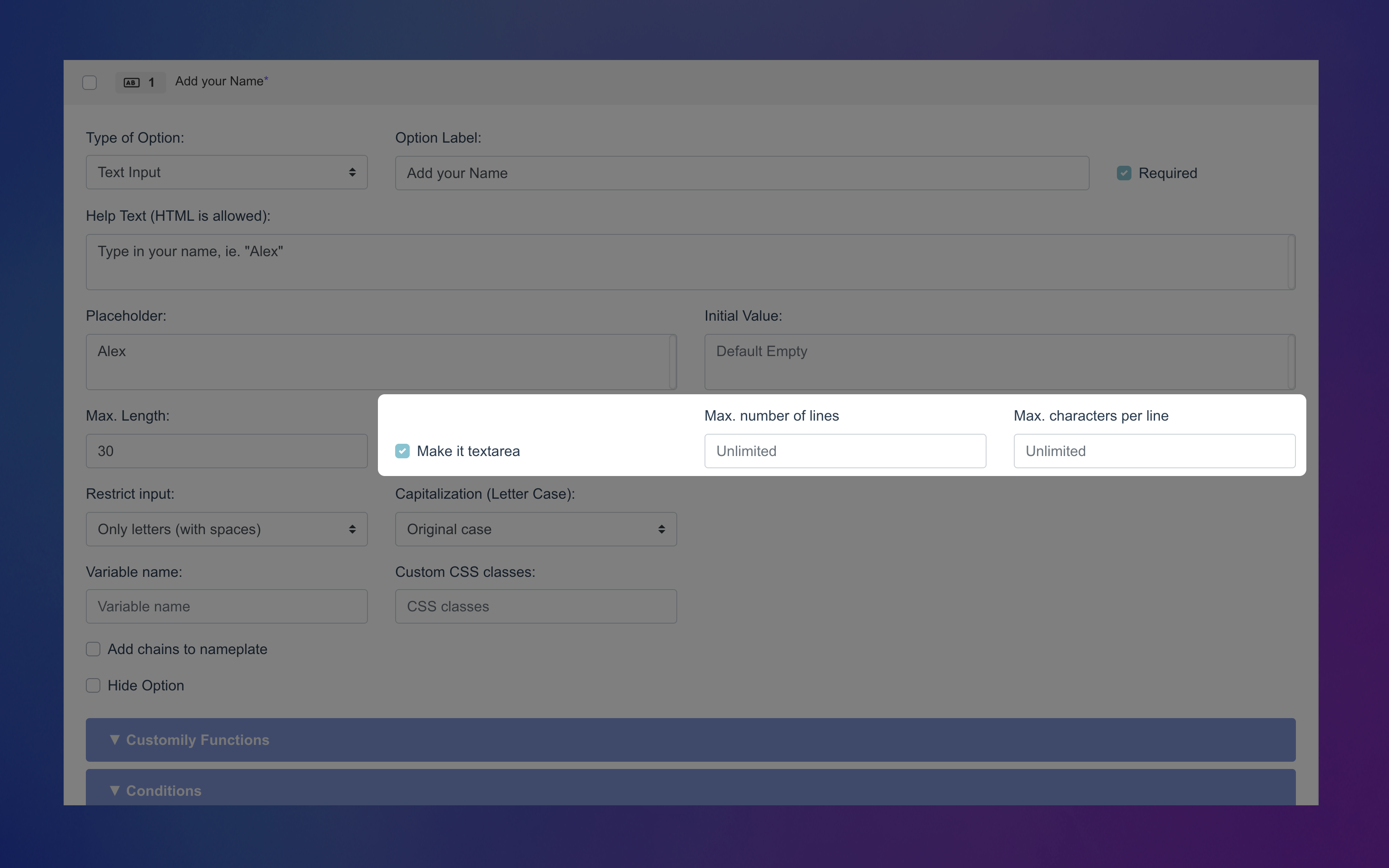 - Text inputs (single-line and multi-line): Let shoppers enter custom text, such as names or messages.