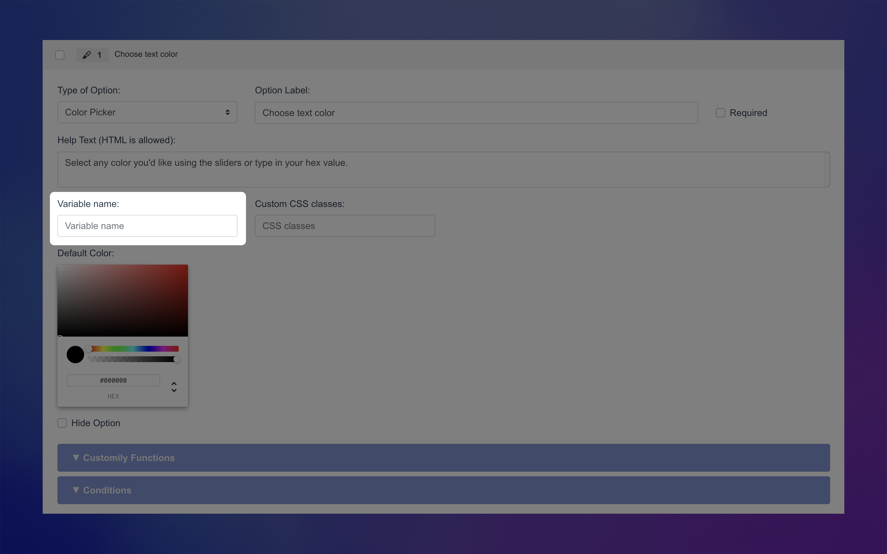 - Color picker: Gives shoppers a color selector to choose any custom color (instead of pre-set swatches).