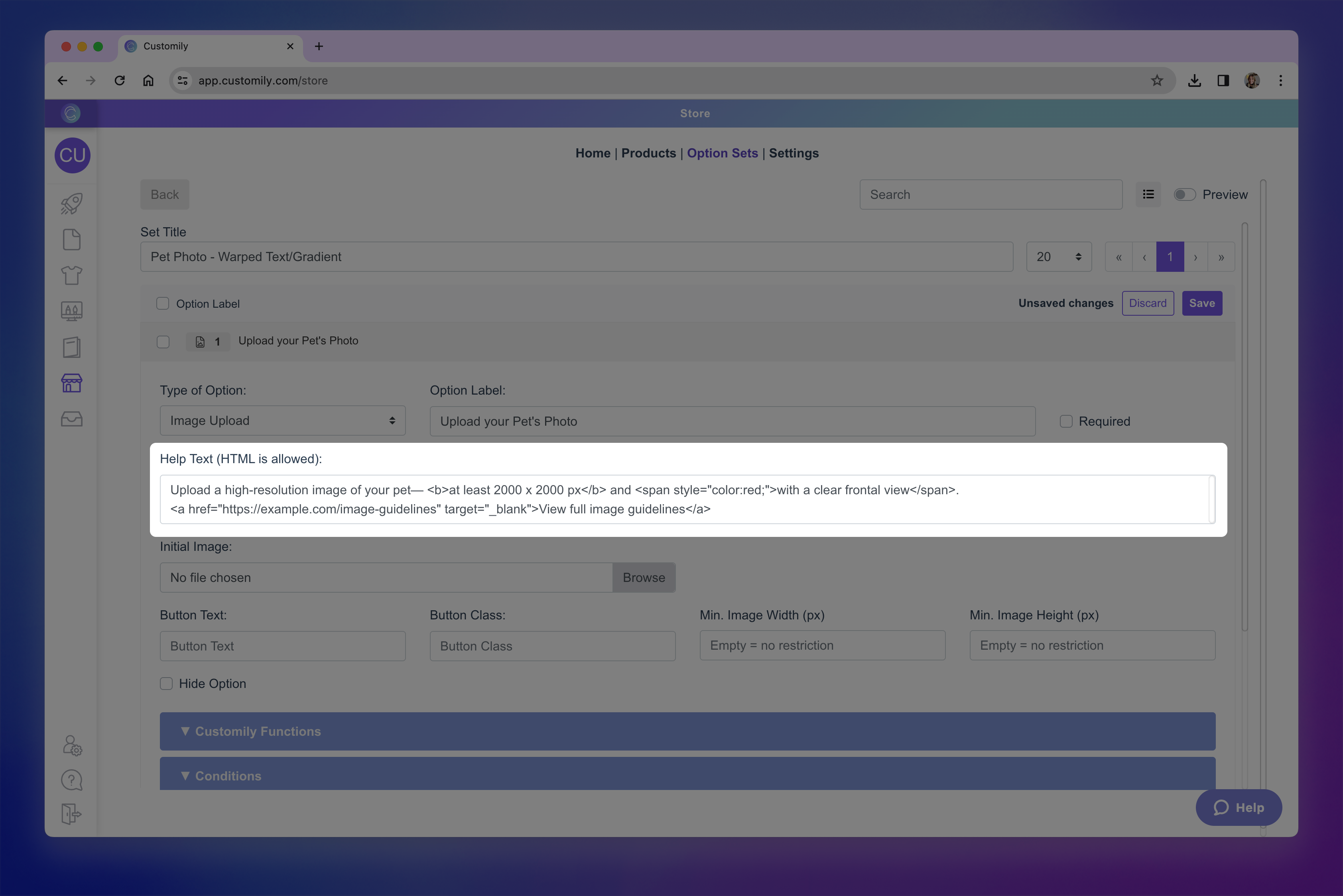 - Image uploads: Let shoppers upload their own images to be added into your design.